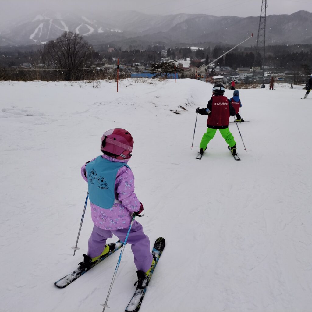 外スキーにしっかり乗る。初日コアラコース、2日目ゾウコース、次回はライオンコースです、すぐ上達するキッズ。雪不足のためコースは山頂から1本しかありませんが、空いているので何本も滑って練習しました。